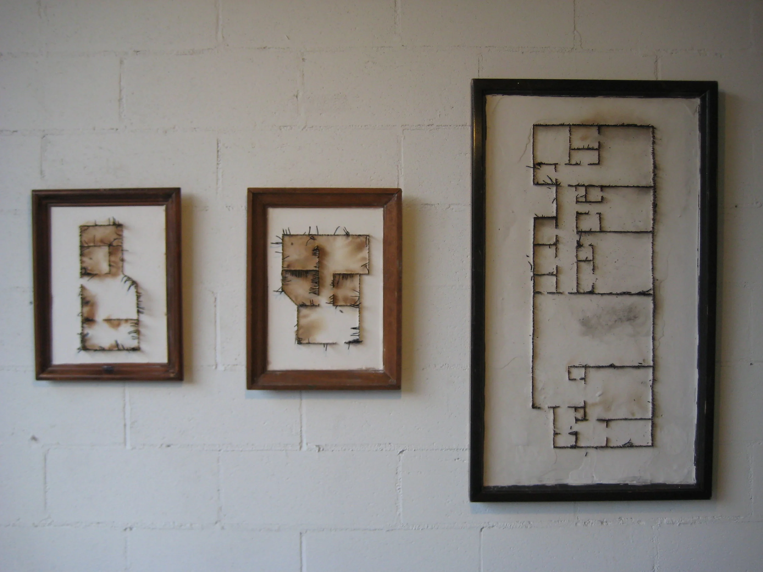 I started playing with matches as an attempt to articulate the impermanence of belonging. In the beginning, I made tiny houses out of found wood and matchsticks. These improbable structures were meant to serve as surrogates for an imagined home of the future. As the series evolved, it became rooted in a more nostalgic endeavor to preserve memories of homes of the past. I started making floor plans of places that had significance in my life. The works were simultaneously a record of my fading memories of these places, and a recognition of their status - either as a current context or a nostalgic scene - indicated by whether or not the work had been burned. The series grew to include maps of places that had significance in my life, and eventually also routes through those spaces along which I traveled frequently.